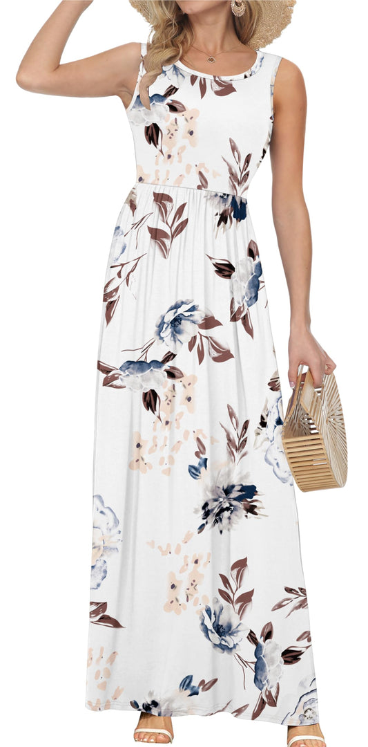 AUSELILY Summer Dresses for Women Casual Sleeveless Maxi Dress Loose Long Dresses with Pockets White Flowers M