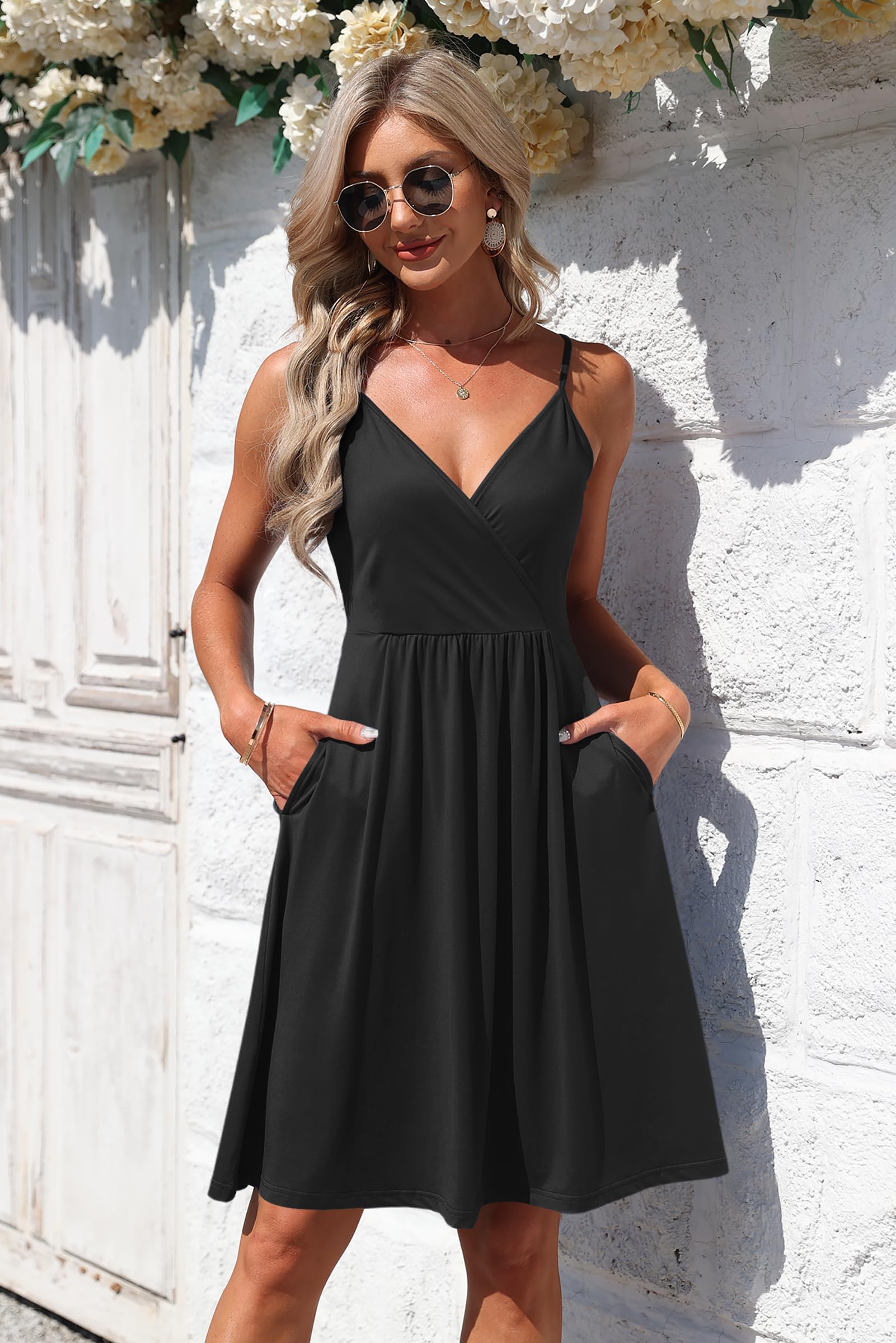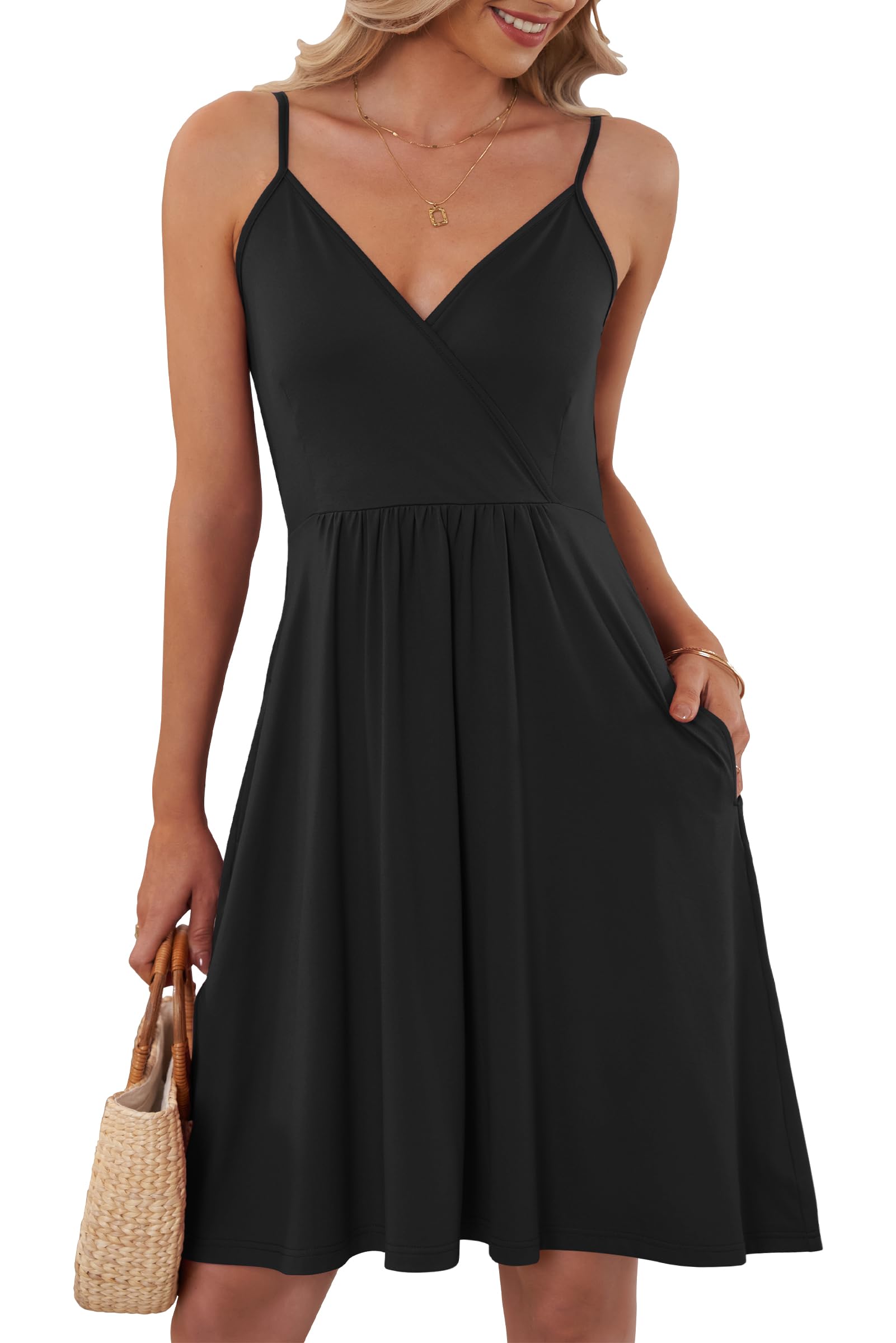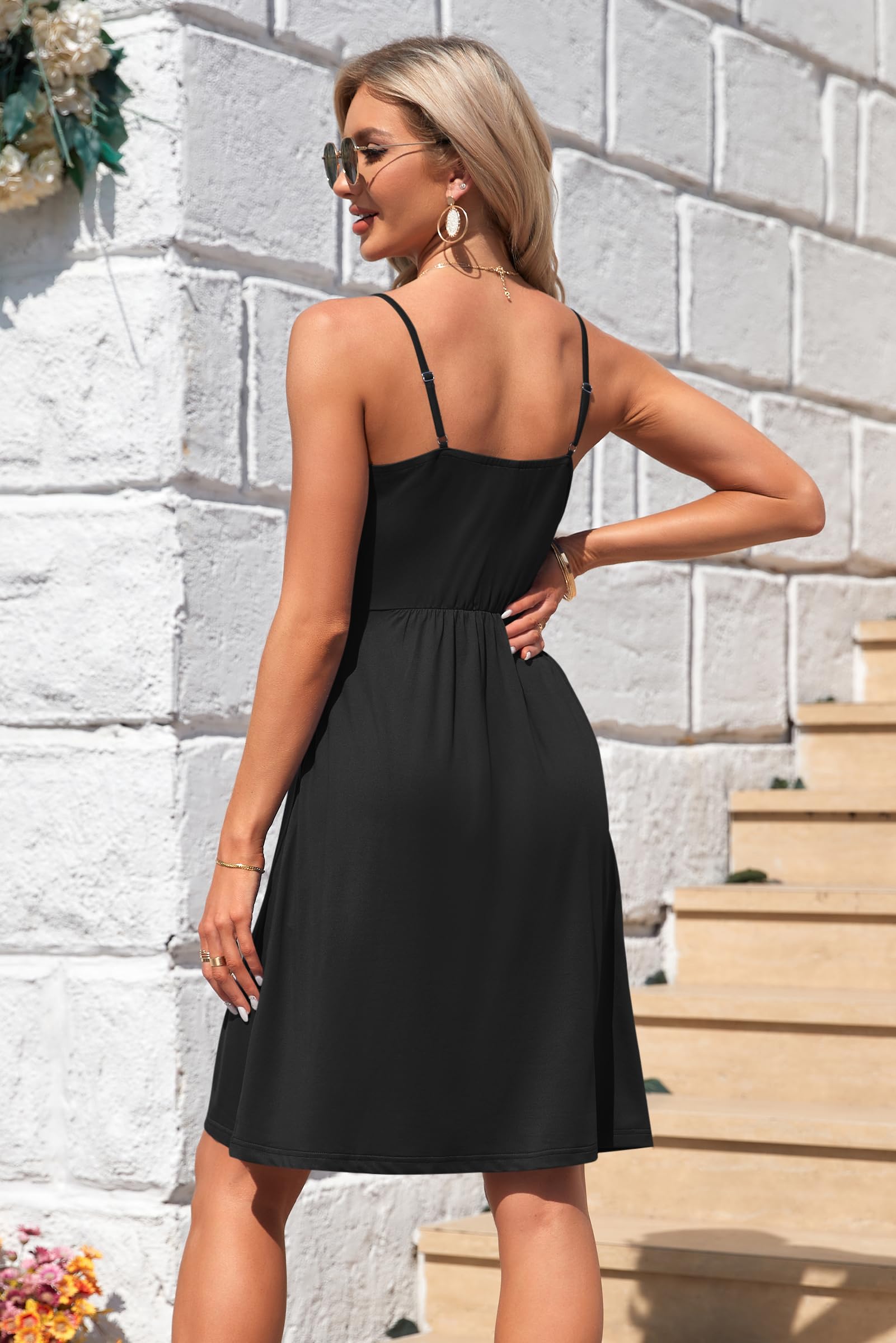 AUSELILY Summer Ladies Dress for Women UK V Neck Spaghetti Strap Casual Dress Beach with Pockets Black L