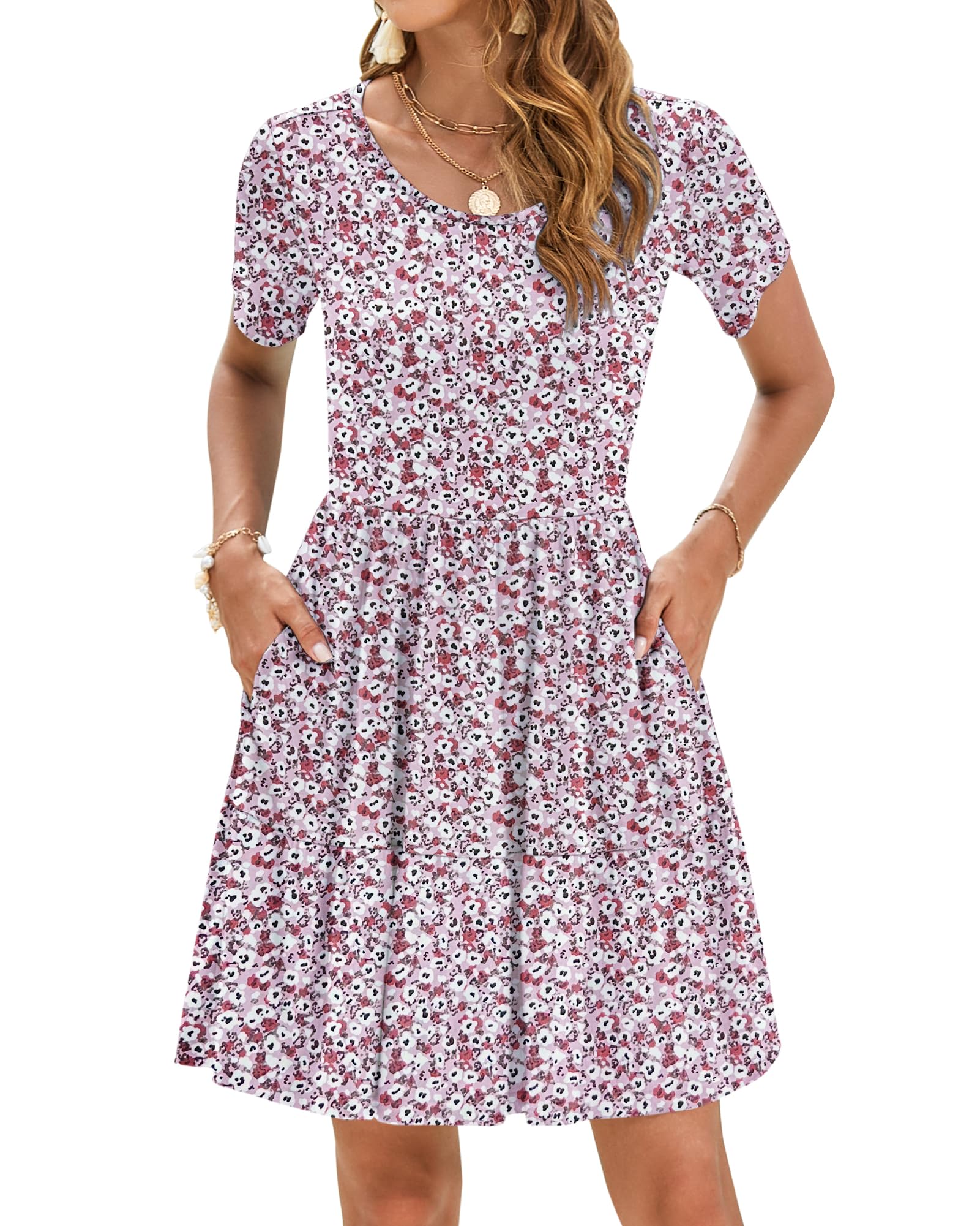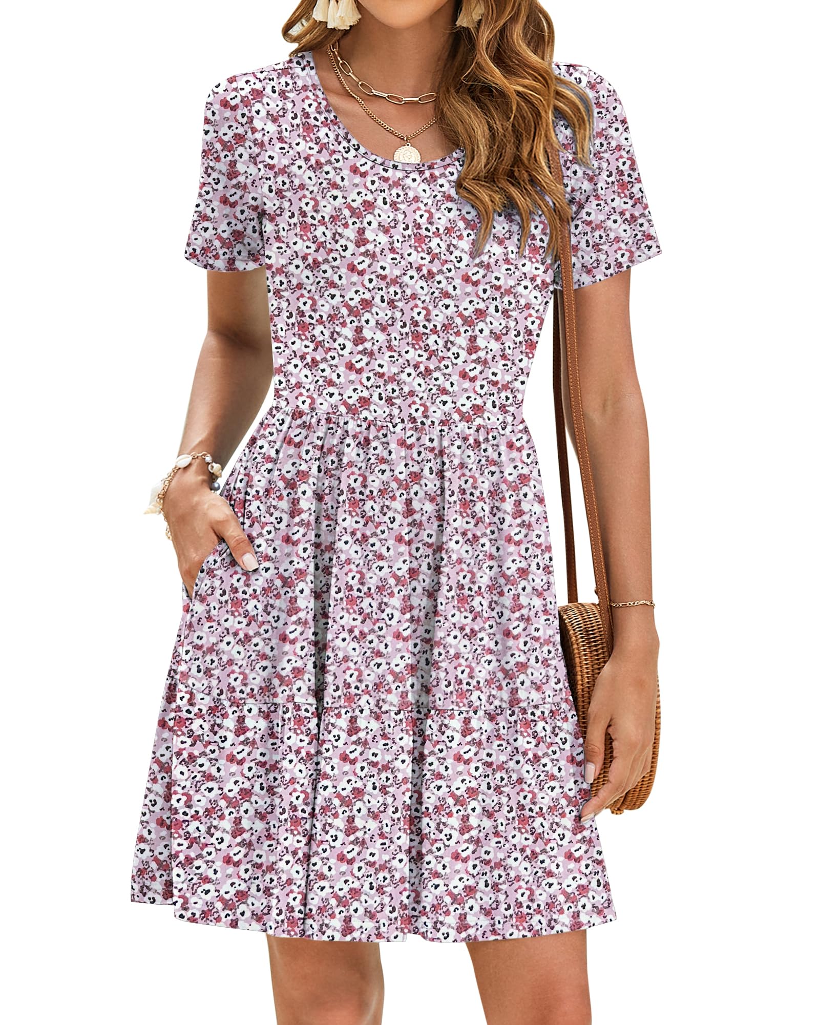 AUSELILY Women's Summer Dress Pleated Knee Length Casual Dress Ladies Short Sleeve T-Shirt Dresses with Pockets Red White Flower M