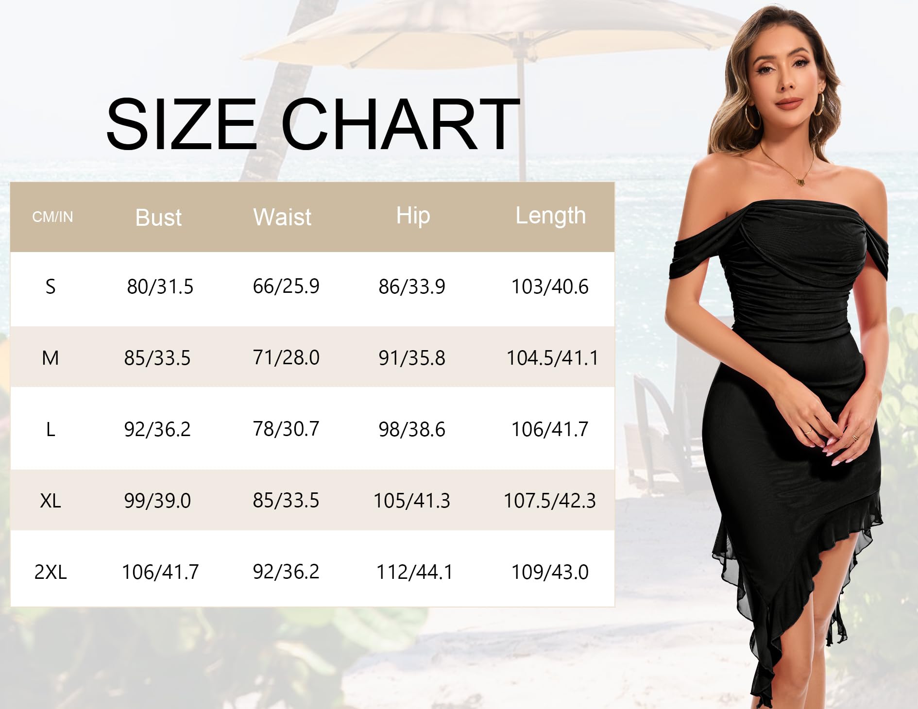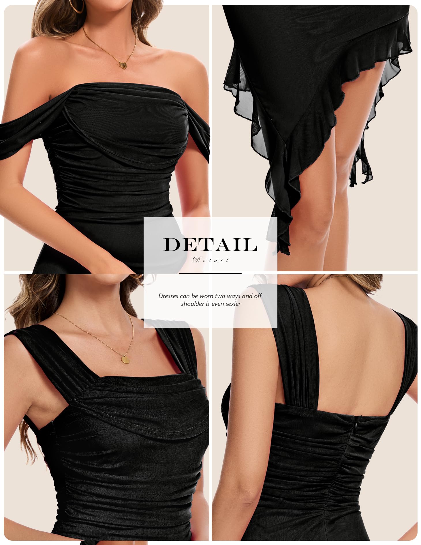 Berylove Women’s Sexy Off Shoulder Mesh Midi Dresses Summer Ruched Bodycon Ruffled Casual Dress BLWY001 Black S